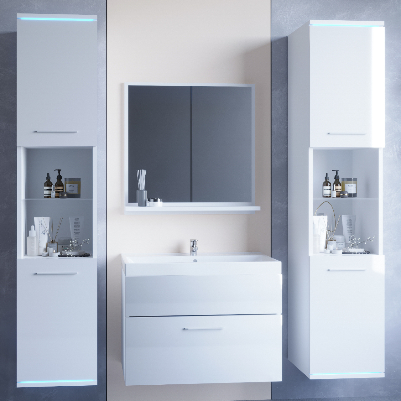 Nábytek lze zakoupit v sestavách a po jednotlivých komponentech. Skříňky jsou vybaveny univerzálními dvířky a zásuvkami s kovovými pojezdy. Dvířka umyvadlové skříňky se otevírají směrem dolů. Skříňka vysoká DO1 má možnost namontovat LED osvětlení na 3 místech. Nábytek pečlivě zabalený, připravený pro vlastní montáž.  |