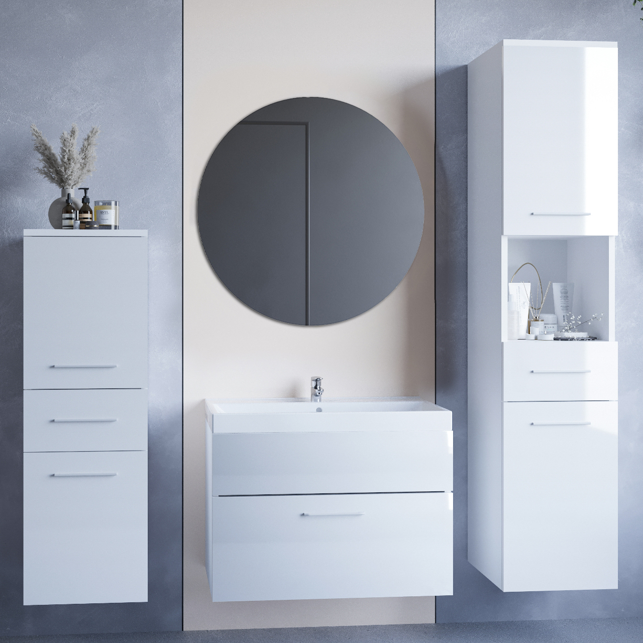 LP1 – Skříňka vysoká (30/140/32) LP2 – Skříňka pod umyvadlo (60/46/35) LP3 – Skříňka nízká (30/92/32) MIR2 – Kulaté koupelnové zrcadlo (60/60)  |