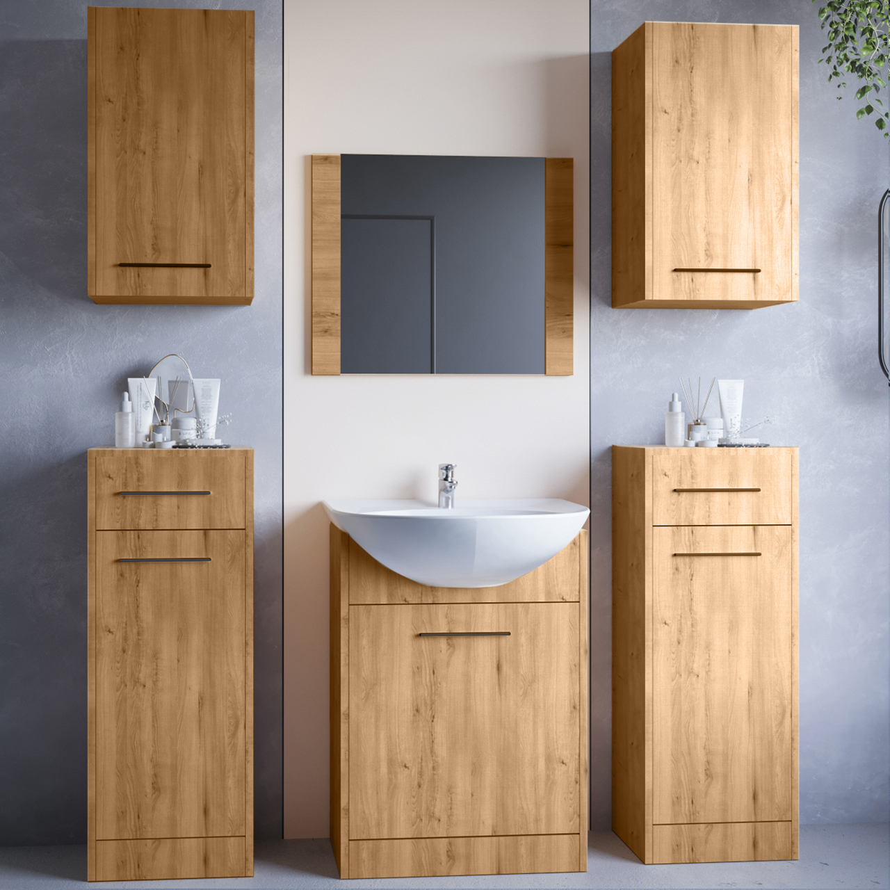 Nábytek lze zakoupit v sestavách a po jednotlivých komponentech. Skříňky jsou vybaveny univerzálními dvířky a zásuvkami s kovovými pojezdy. Přední díl pro umyvadlovou skříňku se otevírá směrem dolů. Nábytek pečlivě zabalený, připravený pro vlastní montáž. |