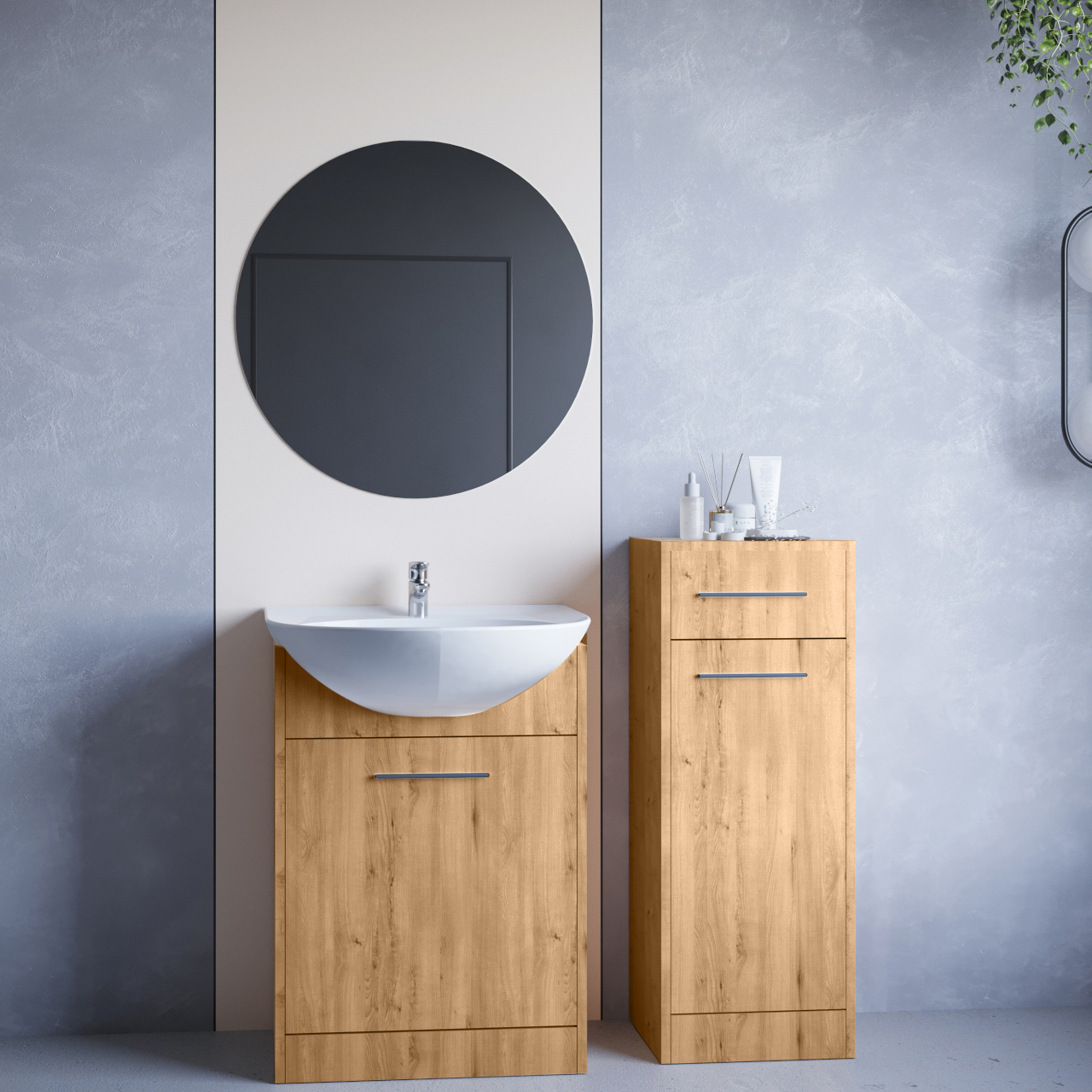 SL2 – Skříňka pod umyvadlo (52/74/30) SL3 – Skříňka nízká (34/90/30) MIR2 – Kulaté koupelnové zrcadlo (60/60) |
