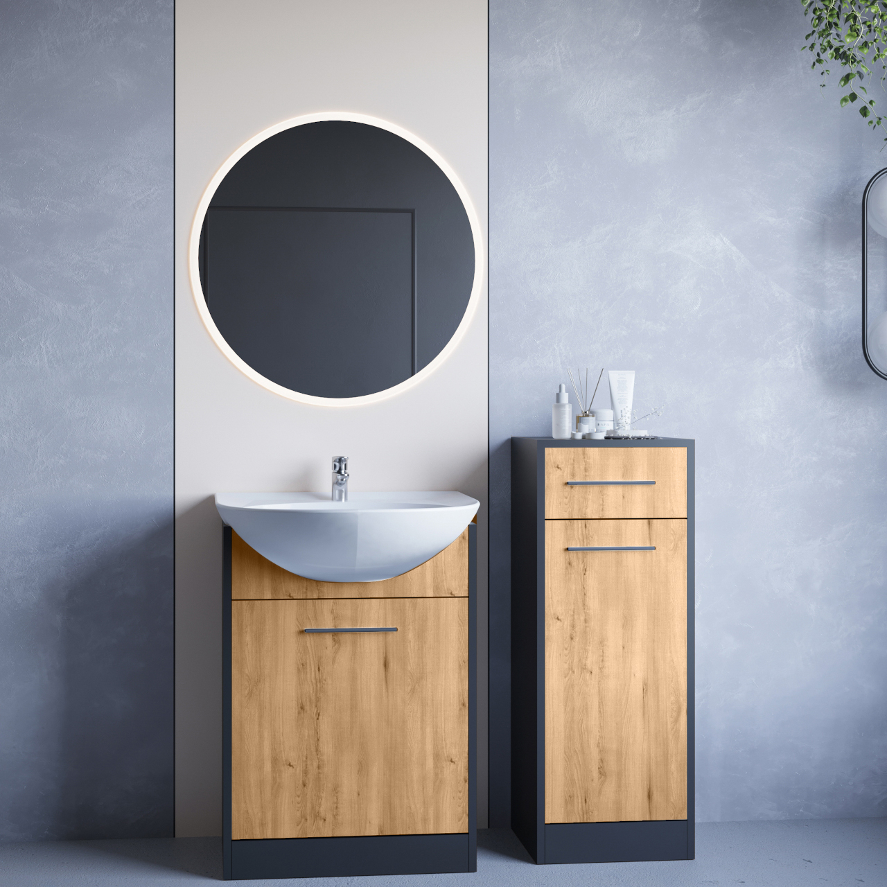 Nábytek lze zakoupit v sestavách a po jednotlivých komponentech. Skříňky jsou vybaveny univerzálními dvířky a zásuvkami s kovovými pojezdy. Přední díl pro umyvadlovou skříňku se otevírá směrem dolů. Nábytek pečlivě zabalený, připravený pro vlastní montáž. Zrcadlo má dotykový spínač světla.  |