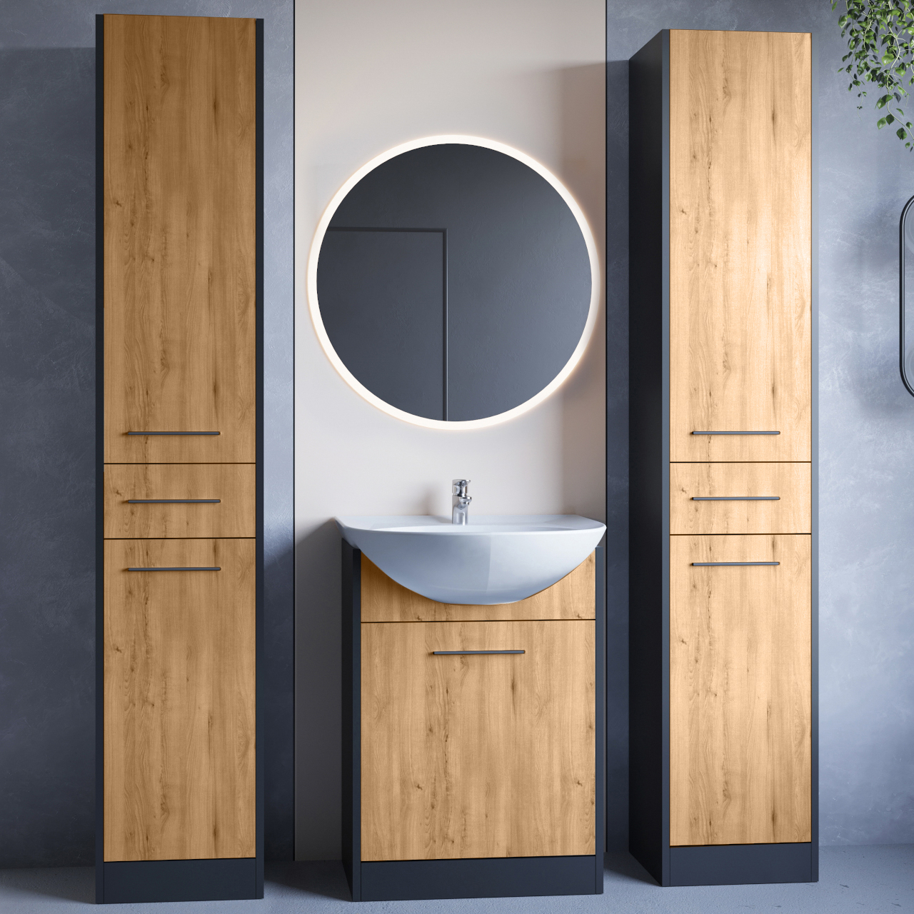 Nábytek lze zakoupit v sestavách a po jednotlivých komponentech. Skříňky jsou vybaveny univerzálními dvířky a zásuvkami s kovovými pojezdy. Přední díl pro umyvadlovou skříňku se otevírá směrem dolů. Nábytek pečlivě zabalený, připravený pro vlastní montáž. Zrcadlo má dotykový spínač světla. |