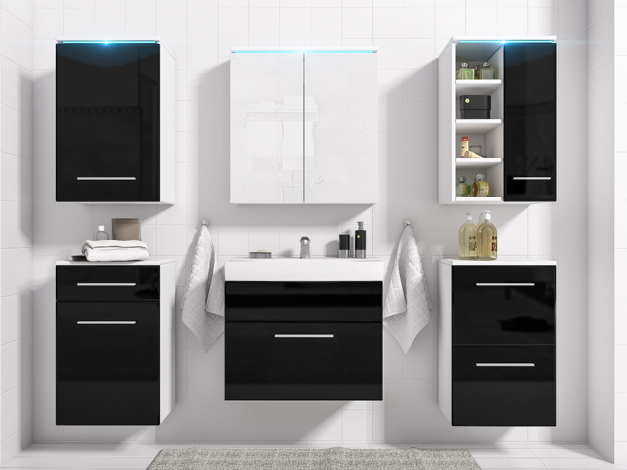 – Skříňka horní Levá (40/64/32) – Skříňka horní se zrcadlem (60/64/15) – Skříňka horní Pravá (40/64/32) – Dolní skříňka Levá (40/64/32) – Skříňka pod umyvadlo (60/51/35) – Dolní skříňka Pravá (40/64/32) |