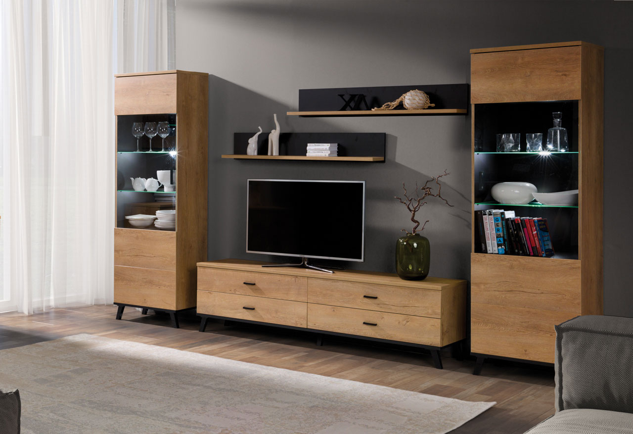 Vitrína Pravá JOHNNY JH2P (61/191/40) Vitrína Levá JOHNNY JH2L (61/191/40) Komoda pod TV JOHNNY JH6 (181/50/40) Police JOHNNY JH10 (120/20/18) x2 |