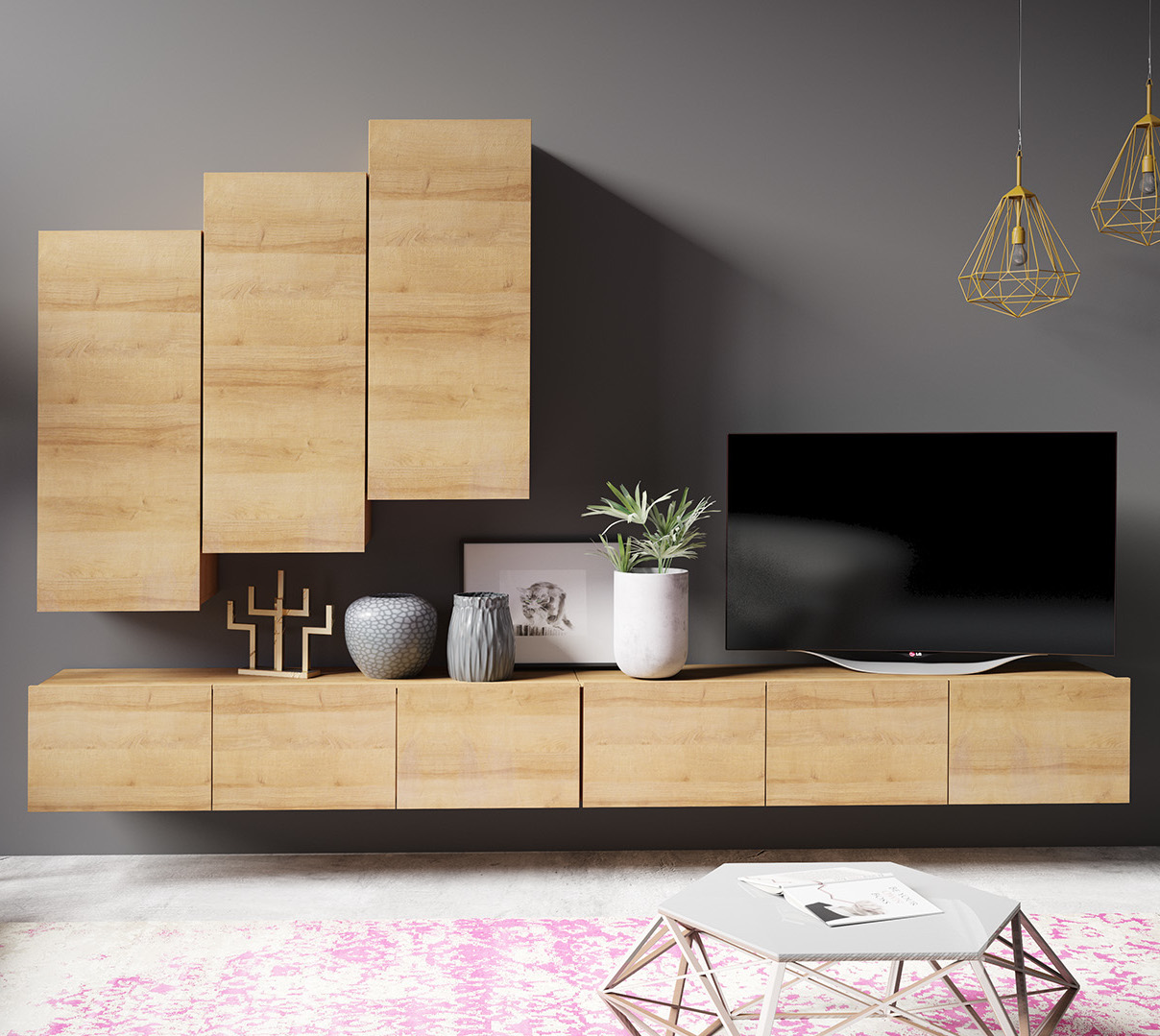 RTV skříňka CALABRIA CL4 (150/37/43) x2 Skříňka závěsná CALABRIA CL8 (45/117/32) x3 |