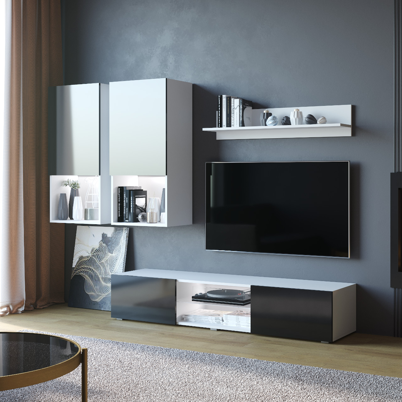 Závěsná vitrína (48/100/30) Závěsná vitrína (48/100/30) Závěsná police (100/20/18) Komoda pod TV (165/33/40) |
