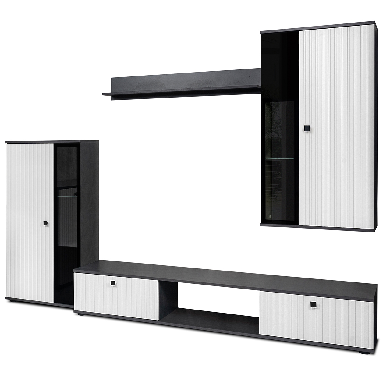 Vitrína stojící (59,3/115/30,6) Závěsná police (102/16/17,5) Závěsná vitrína (59,3/113/30,6) Komoda pod TV (175,5/27,7/40,2) |