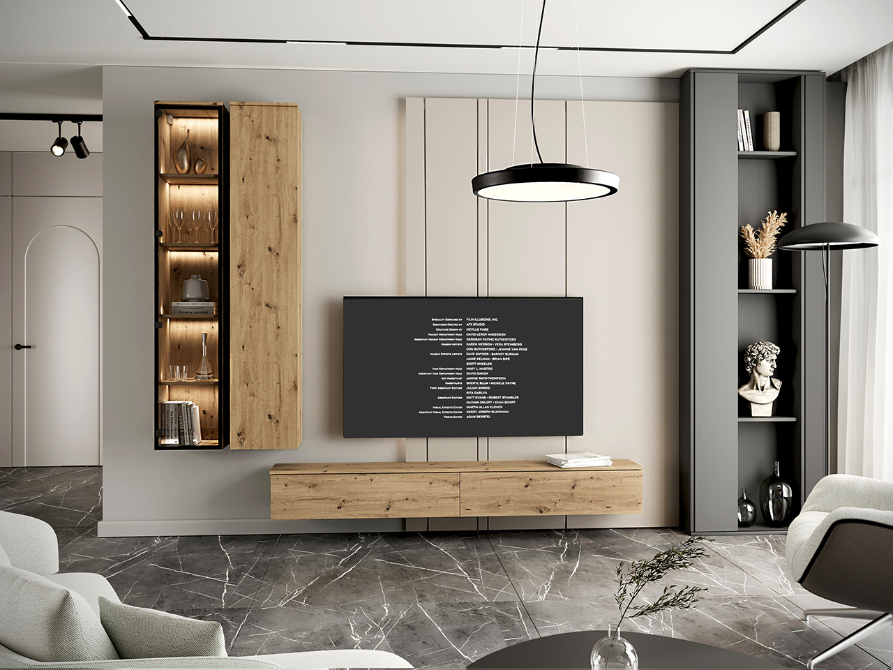 Komoda pod TV 200 FIGO 01 (200/25-42/28) Skříňka závěsná FIGO 02 (35/180/30) Závěsná vitrína FIGO 03 (35/180/30) |