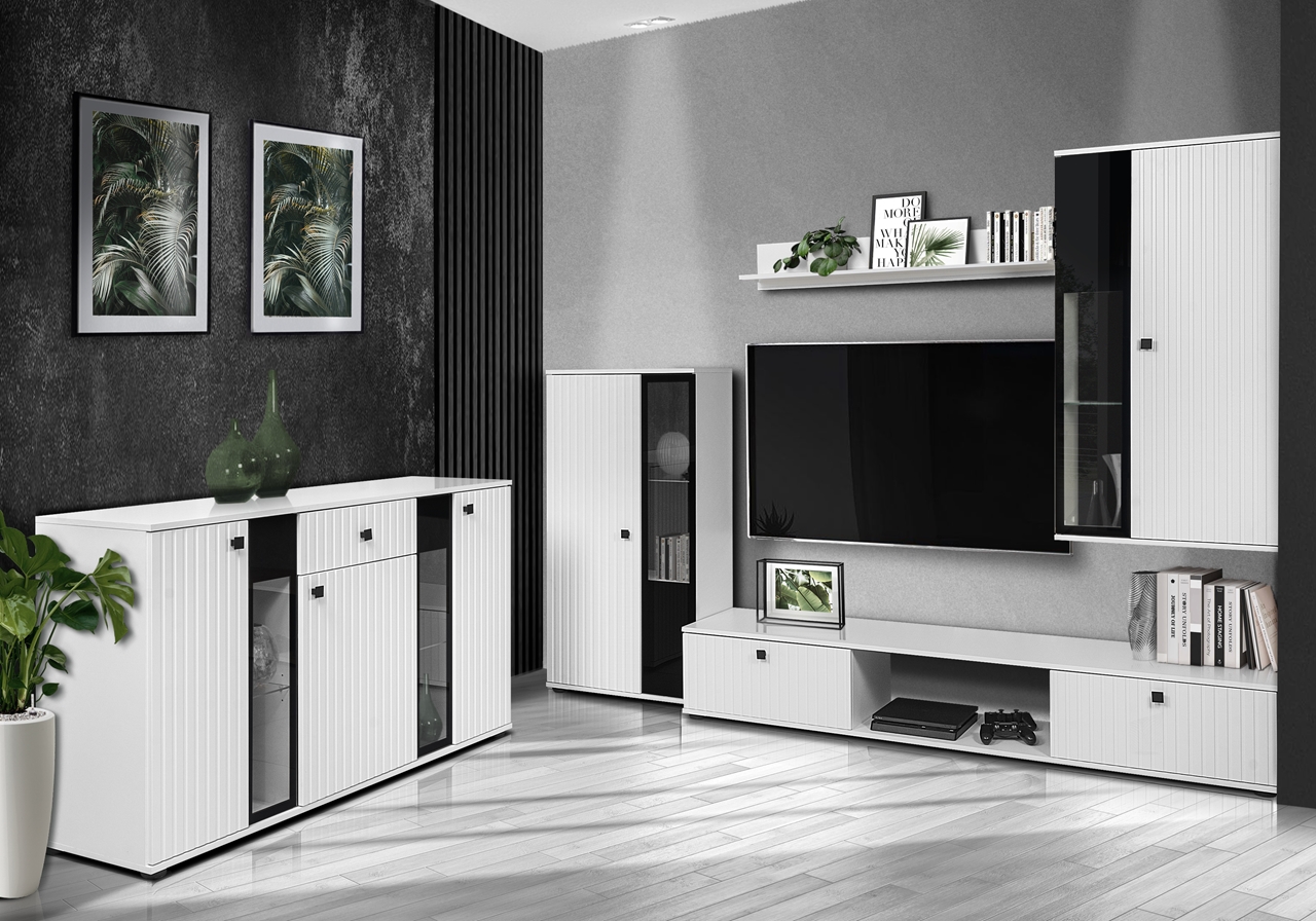 Vitrína stojící (59,3/115/30,6) Závěsná police (102/16/17,5) Závěsná vitrína (59,3/113/30,6) Komoda pod TV (175,5/27,7/40,2) Komoda (140/80/40) |