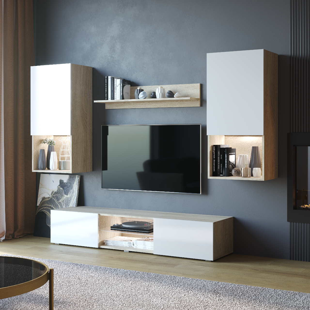 Závěsná vitrína (48/100/30) Závěsná vitrína (48/100/30) Závěsná police (100/20/18) Komoda pod TV (165/33/40) |
