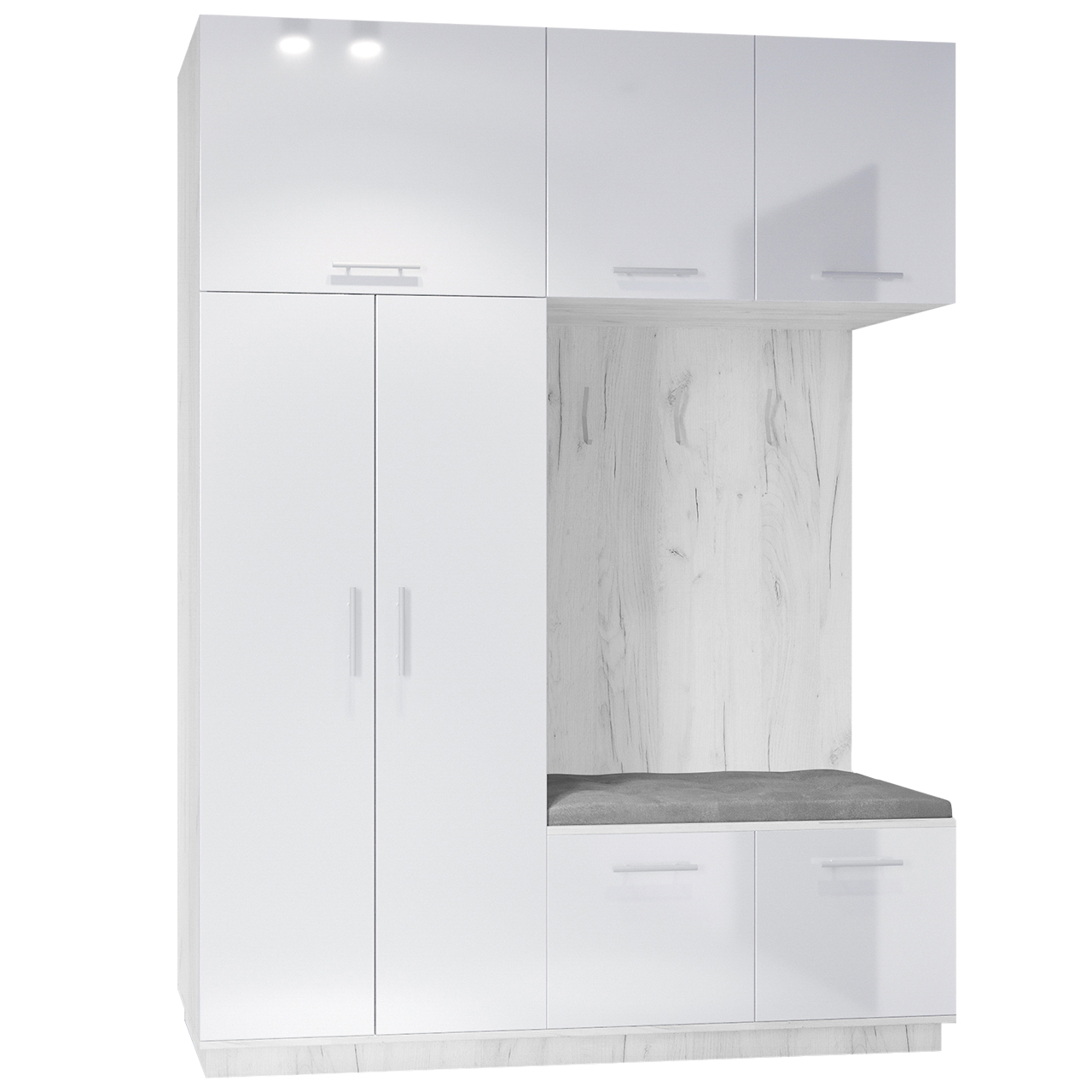 SKU: Garderoba prawa c.biały/b.połysk(G/CR-B) + poduszka szary (MO-84) Kategorie: